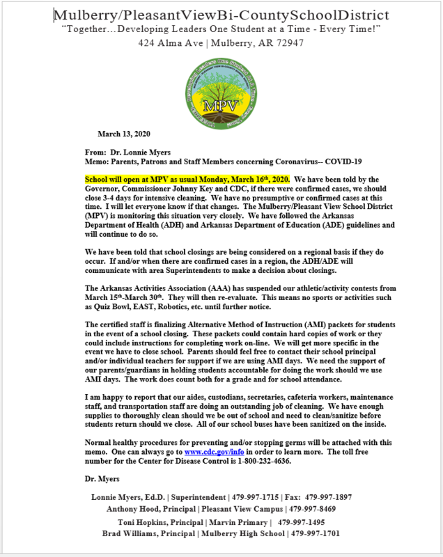 Letter From Our Superintendent Dr Myers Regarding Covid 19 Mulberry Pleasant View Bi County School